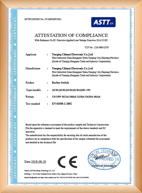 Chimai Electronic sản xuất cả công tắc bập bênh một cực và hai cực với nhiều hình dạng, màu sắc và kích cỡ bộ truyền động khác nhau. Một số mẫu phổ biến bao gồm dòng KCD1, KCD2 và KCD4. Các công tắc được thiết kế bền bỉ, có tuổi thọ hơn 10.000 chu kỳ. Chúng cũng được đánh giá cho các mức điện áp và dòng điện khác nhau, từ 6A đến 20A.